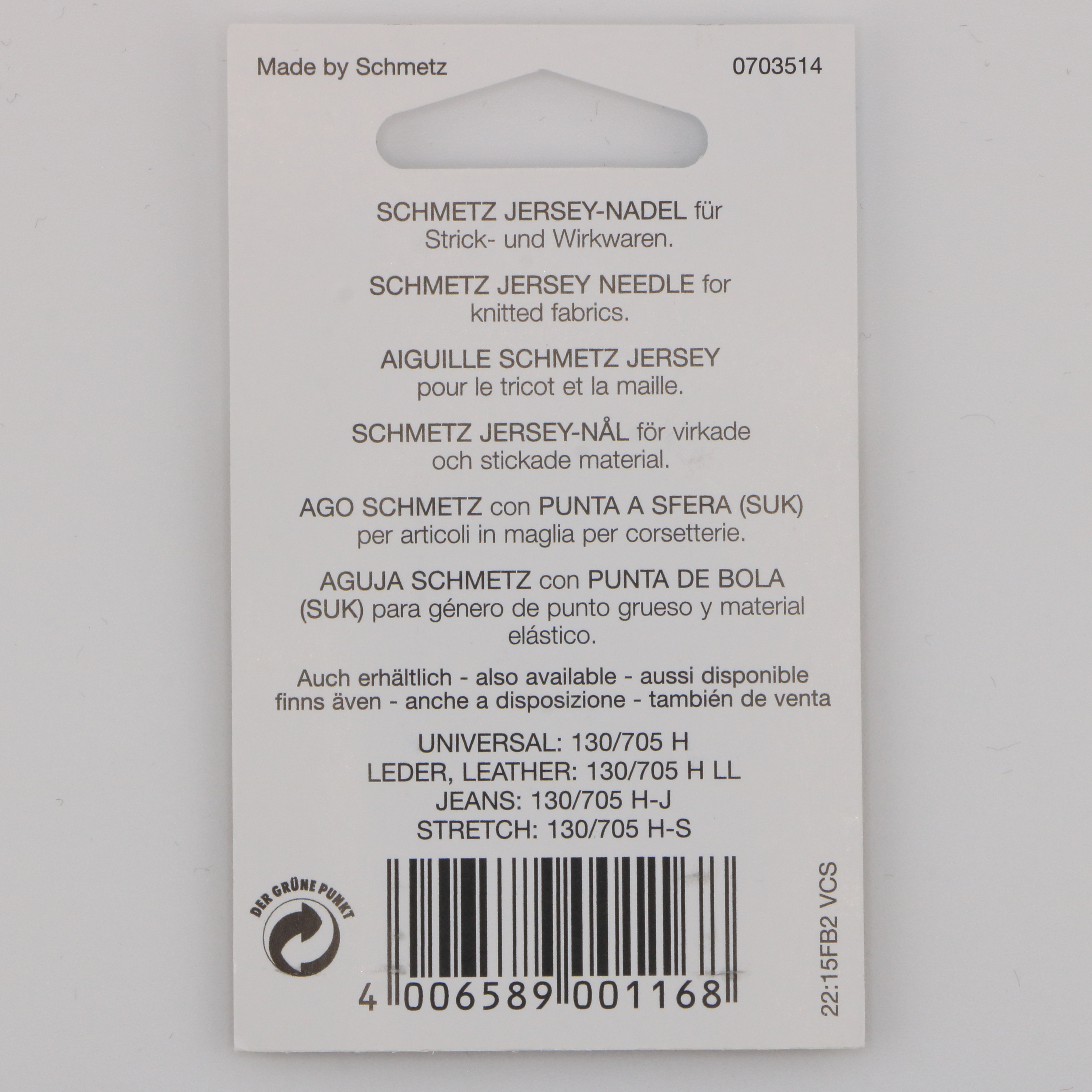 Aiguille Jersey de taille NM 70 SUK (US 10), système 130/705 H‑HAx1, compatible avec toutes les machines à coudre familiales à talon plat. Sa pointe boule permet de coudre les tissus en maille fine (jersey de coton, interlock léger…) sans abîmer les fibres, pour des coutures souples, nettes et durables.