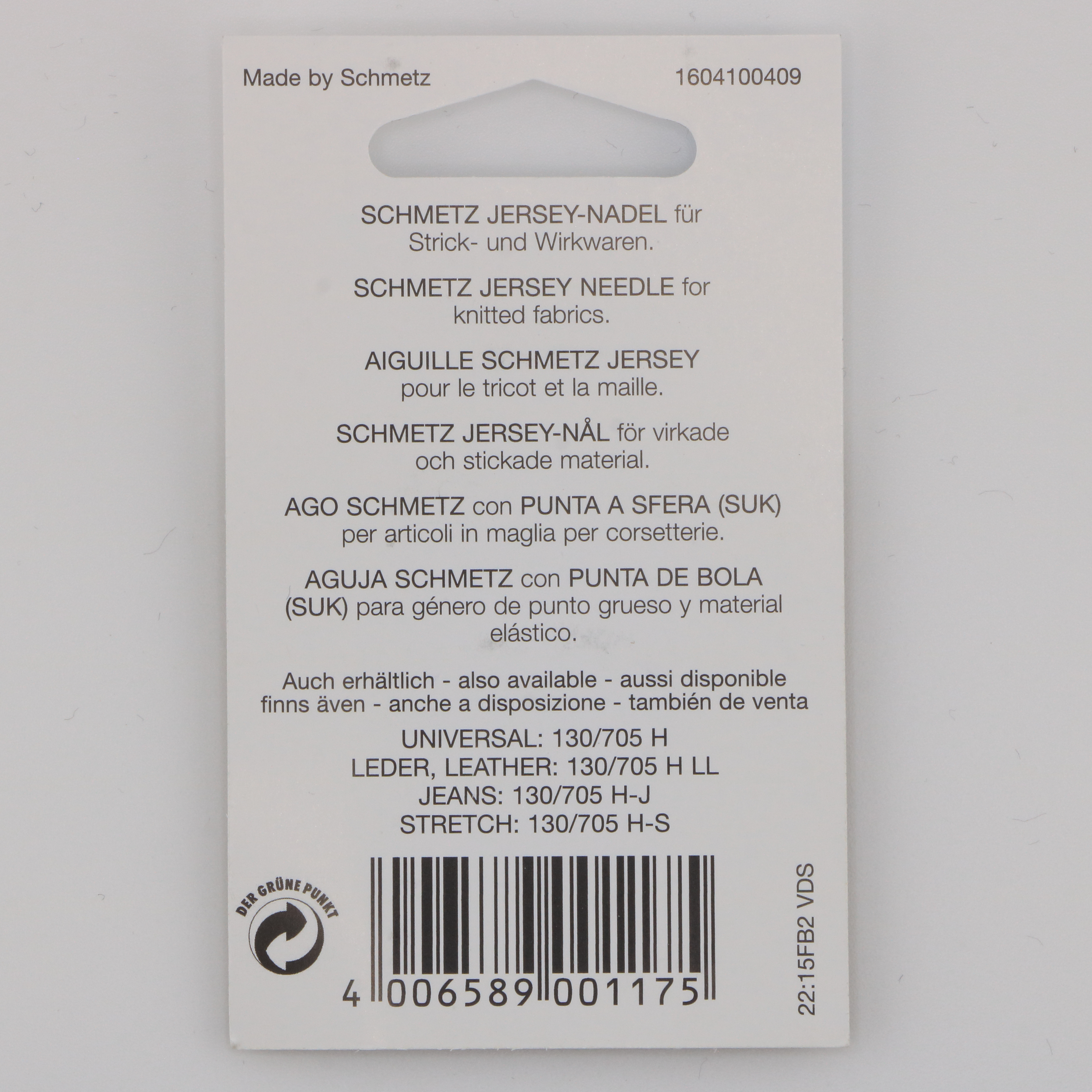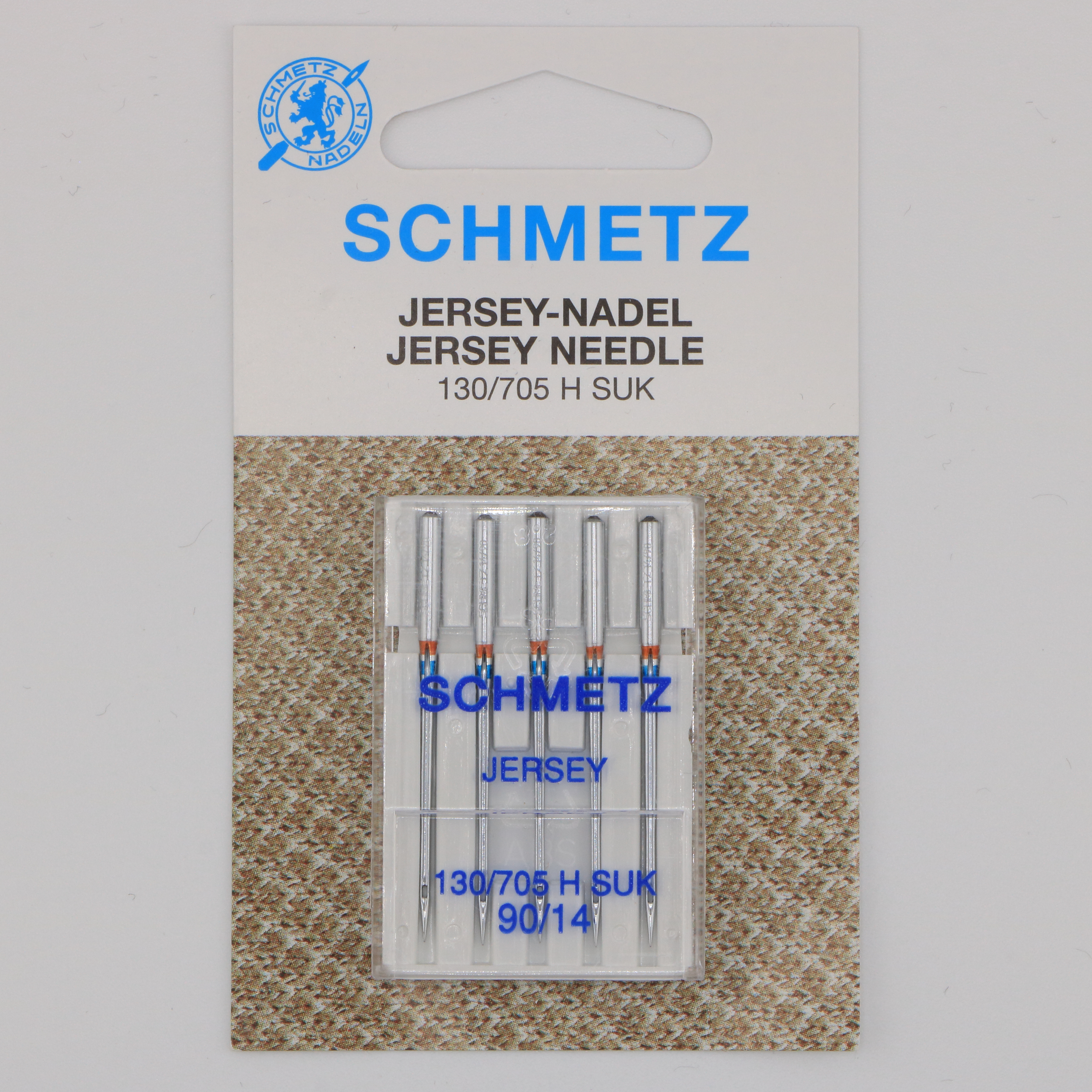 Aiguille Jersey de taille NM 90 (US 14), système 130/705 H SUK, compatible avec toutes les machines à coudre familiales utilisant des aiguilles à talon plat. Sa pointe boule traverse sans accrocs les mailles épaisses (sweat, interlock, jersey lourd…), pour une couture fluide, solide et sans points sautés.