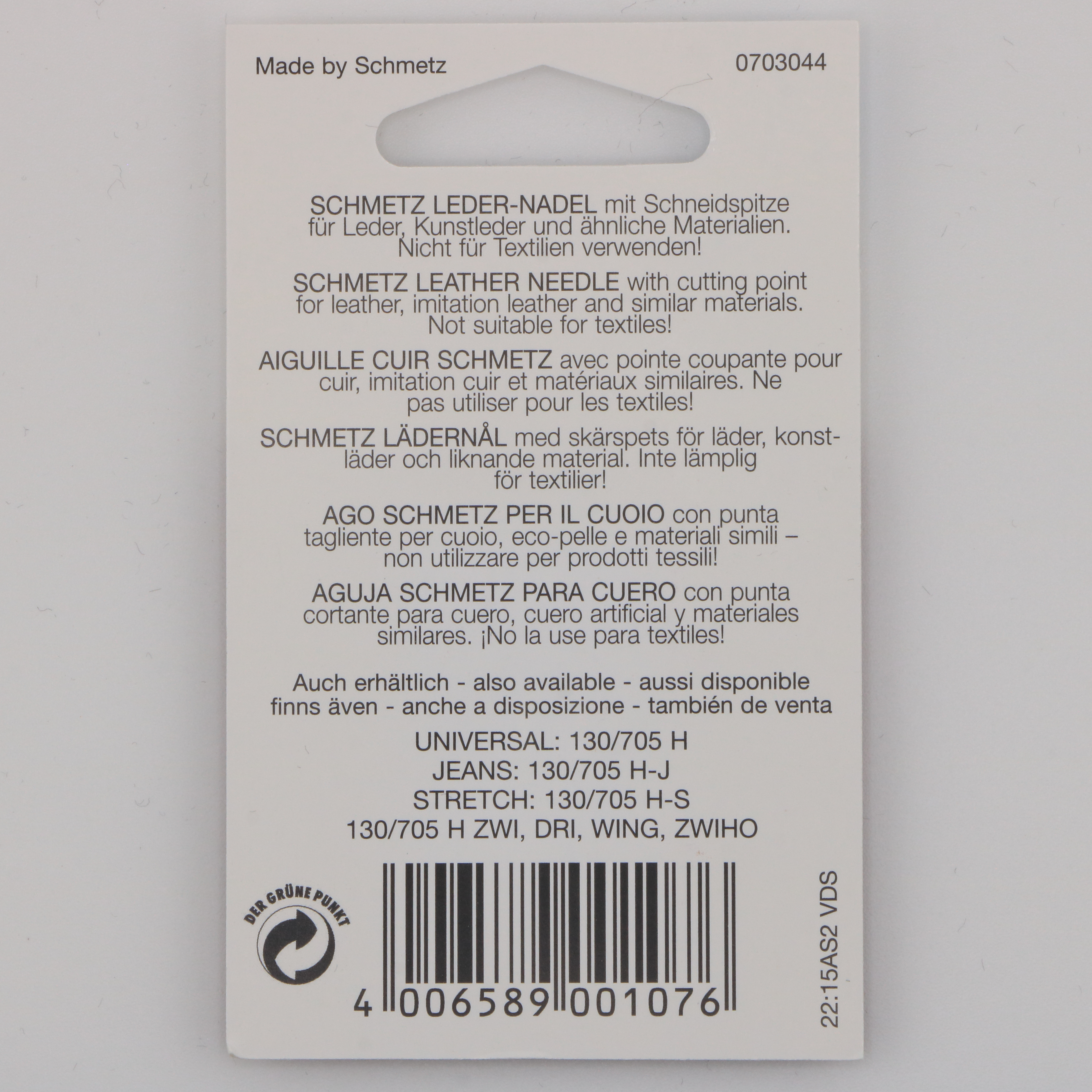 Aiguille cuir NM 100 (US 16), système 130/705 H LL, pour machines domestiques à talon plat. Sa pointe en lancette traverse les cuirs épais, les similis rigides et les matériaux denses sans les déchirer. L’arme idéale pour des coutures franches et nettes sur des supports costauds.
