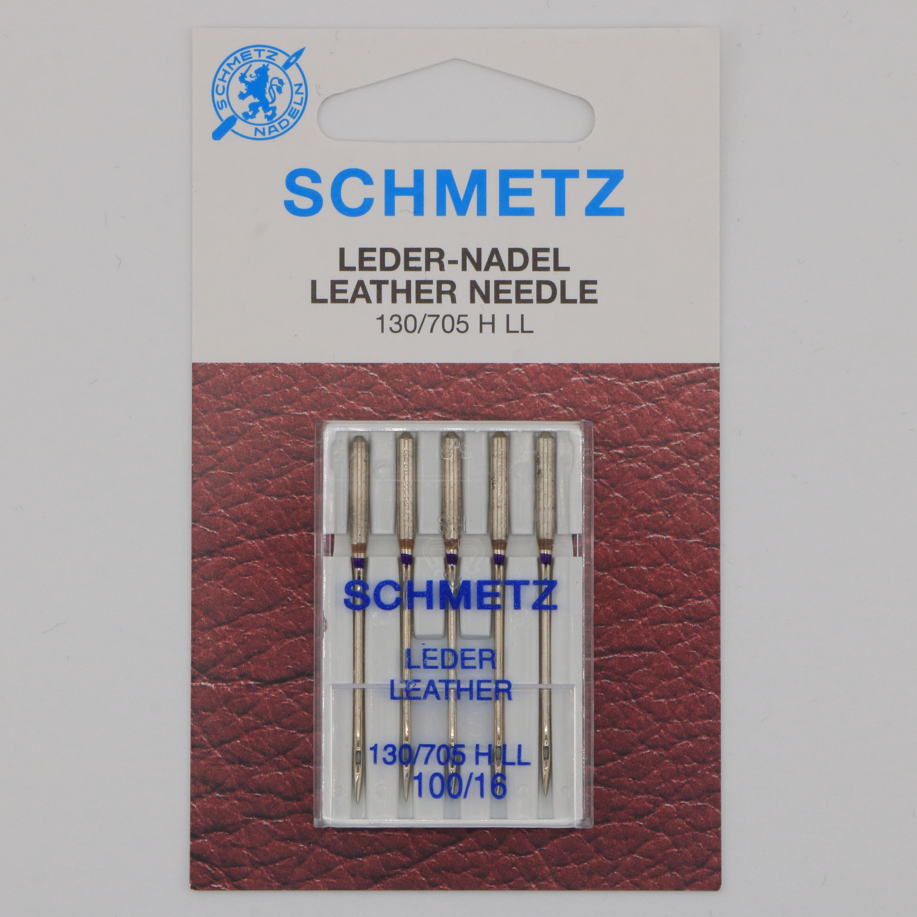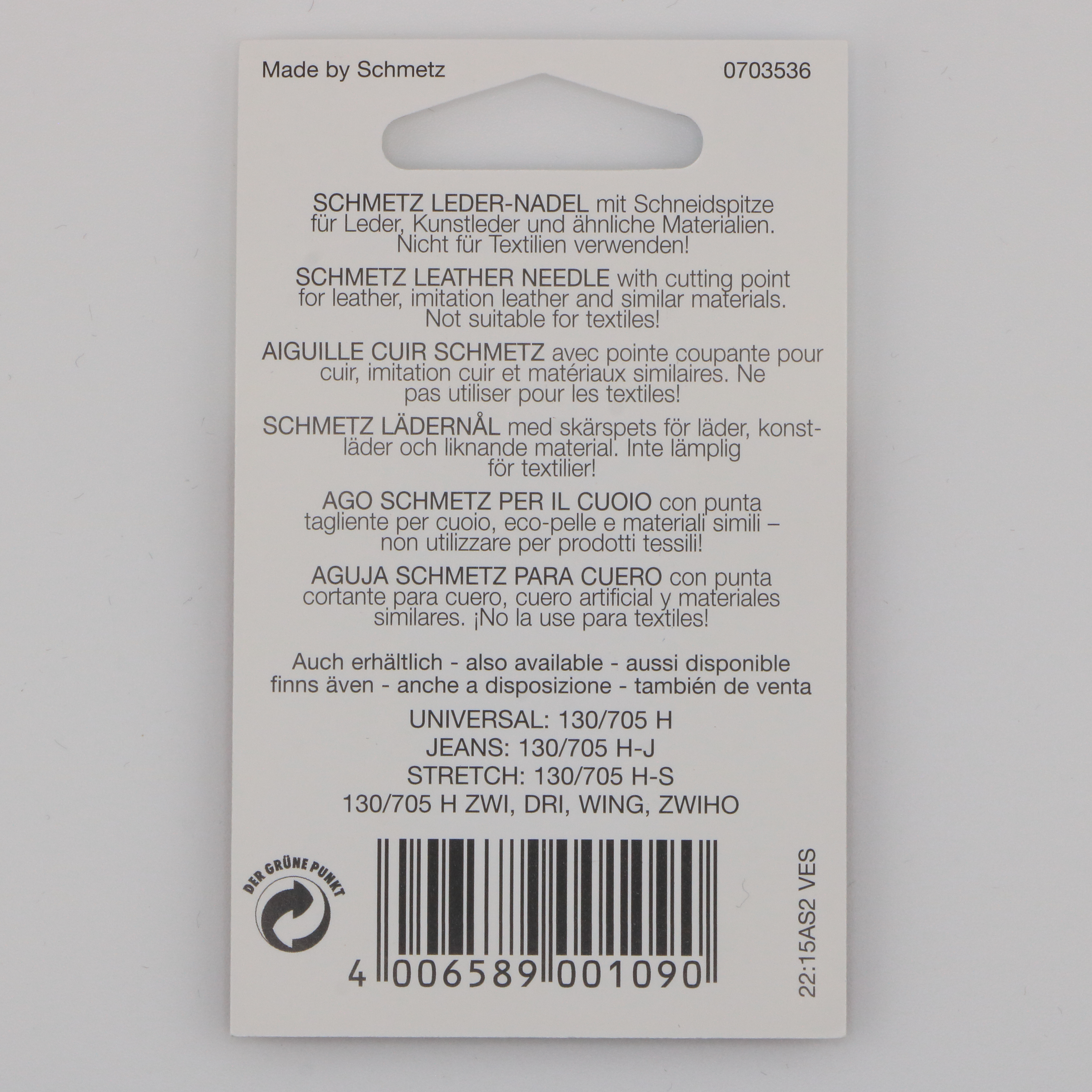 Aiguille cuir de taille NM 90 (US 14), système 130/705 H LL, pour machines familiales à talon plat. Sa pointe tranchante en forme de lancette est conçue pour percer proprement le cuir, le simili ou le vinyle souple, en assurant une couture nette et régulière sans déchirure.