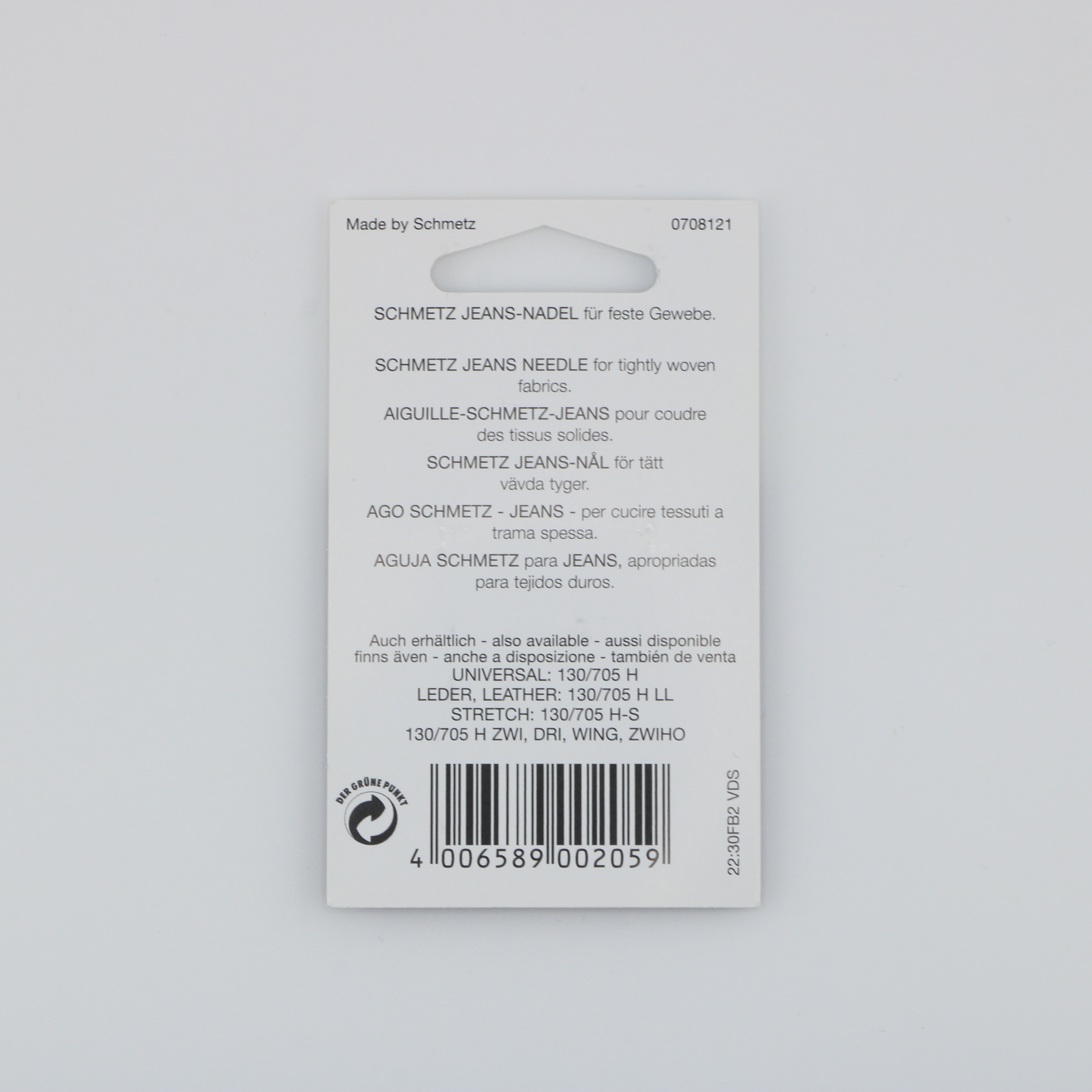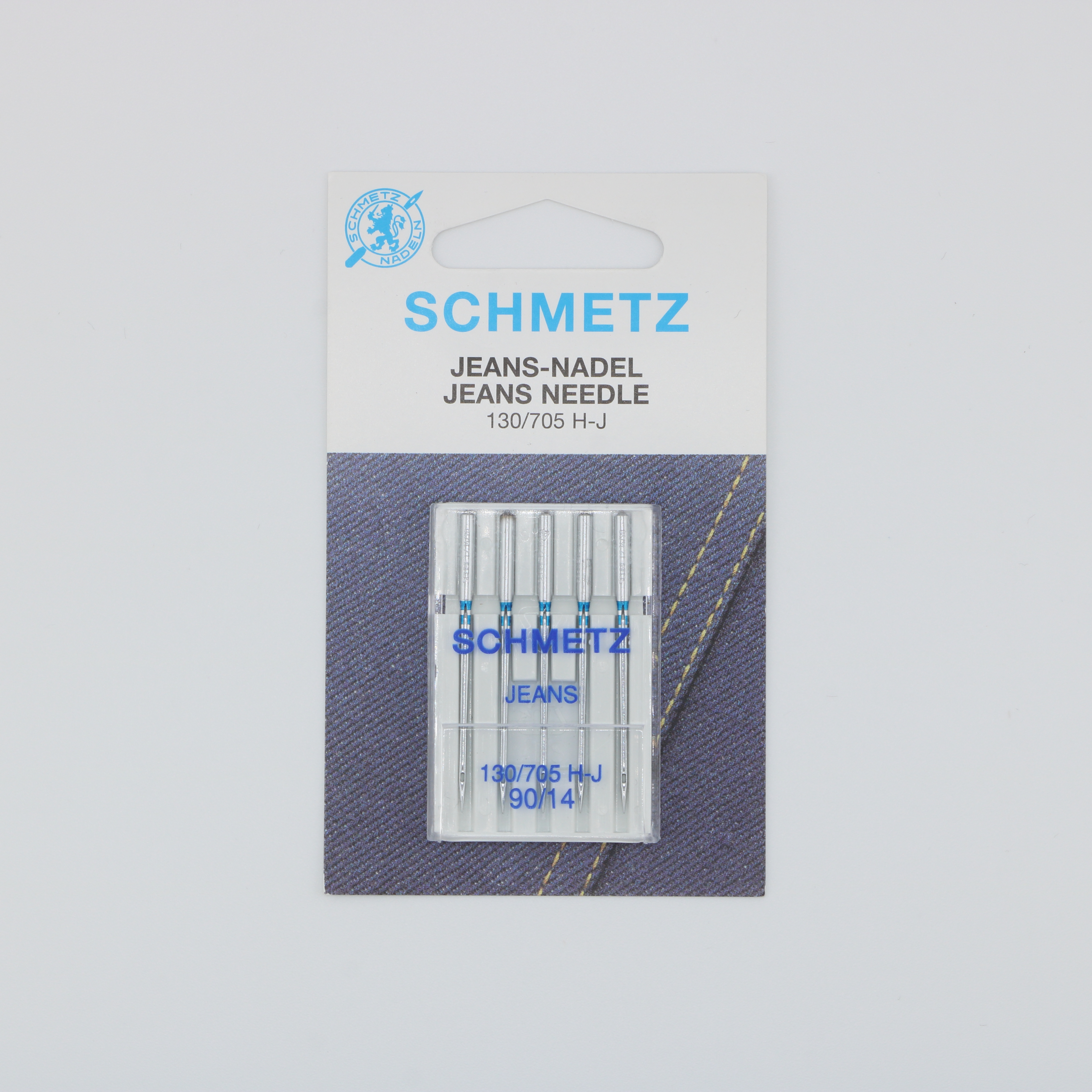Aiguille NM 90 spéciale jeans, système 130/705 H-J, compatible avec les machines à coudre familiales. Parfaite pour traverser les tissus denses comme le denim, la gabardine ou la toile canvas sans casser ni sauter de point. Sa pointe spéciale glisse entre les fibres serrées sans les couper.