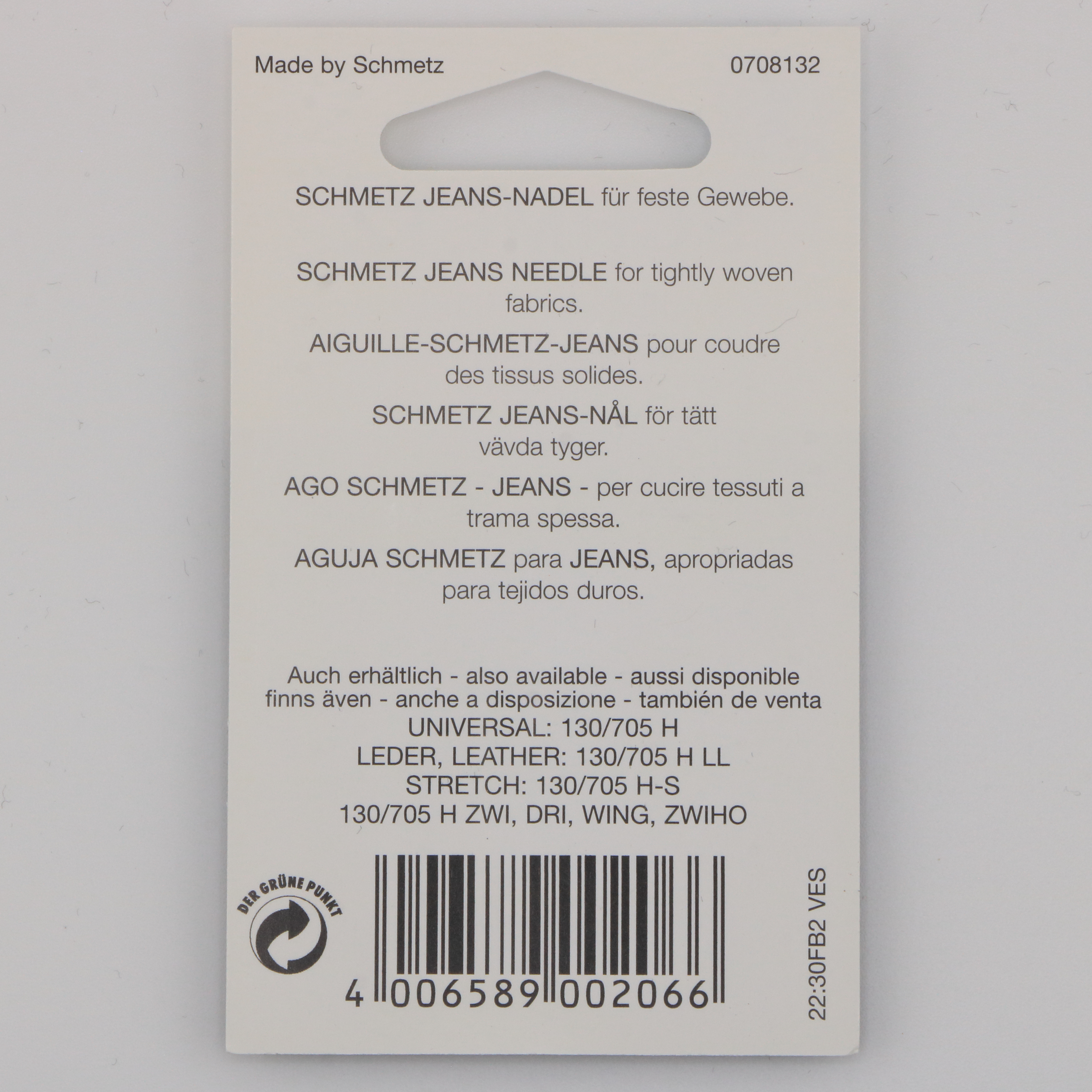 Aiguille spéciale Jeans NM 110 (US 18), système 130/705 H-J, pour machines familiales puissantes. Parfaite pour traverser sans broncher les coutures très épaisses de denim, gabardine ou toile rigide. Conçue pour les gros travaux de couture sur matières robustes.