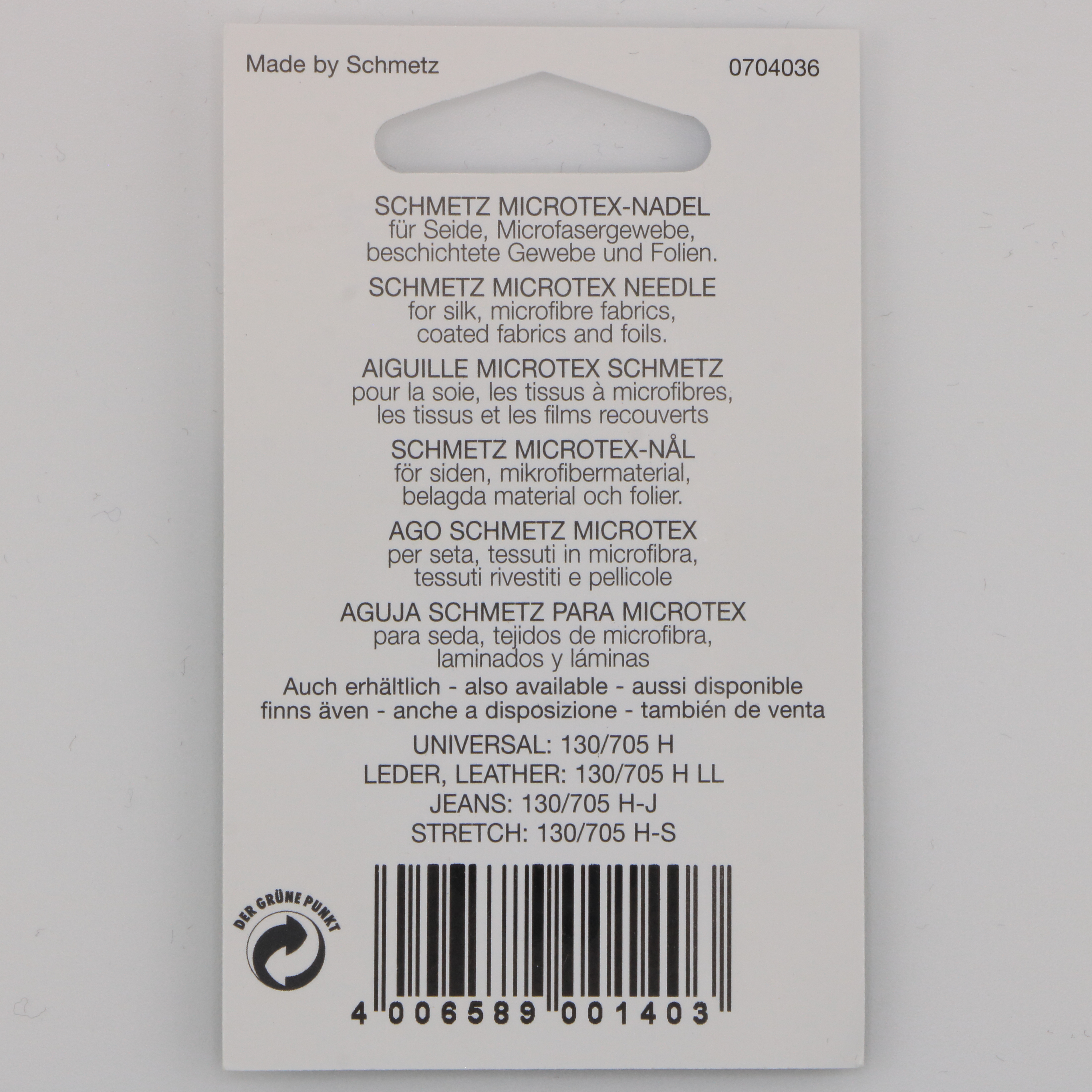 Aiguille Microtex NM 60, NM 70, NM 80, système 130/705 H-M. Sa pointe ultra fine et acérée est idéale pour les coutures nettes sur soie, popeline, microfibre, enduits légers ou tissus techniques. Pour les coutures précises sur matières sensibles, sans bavures ni accrocs.