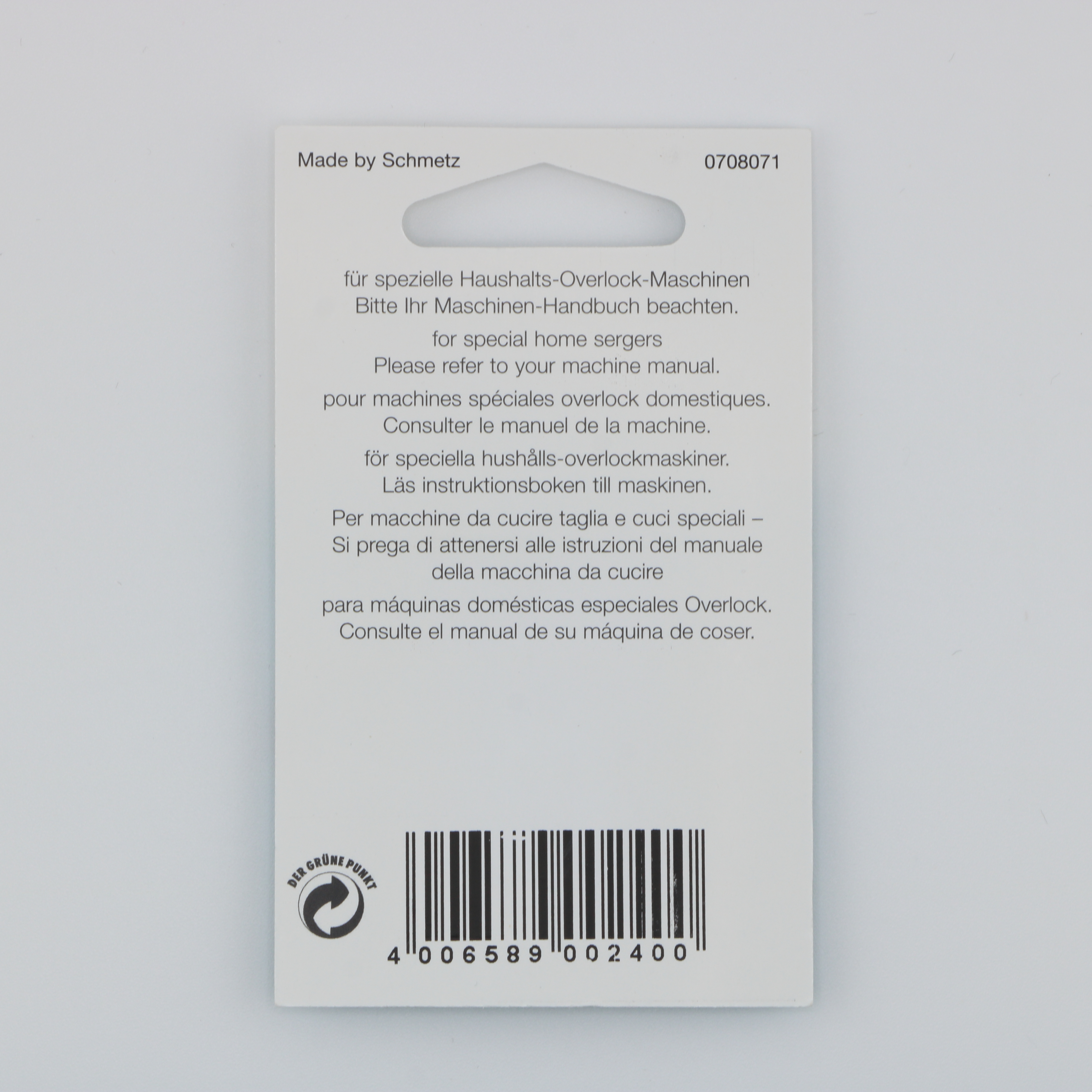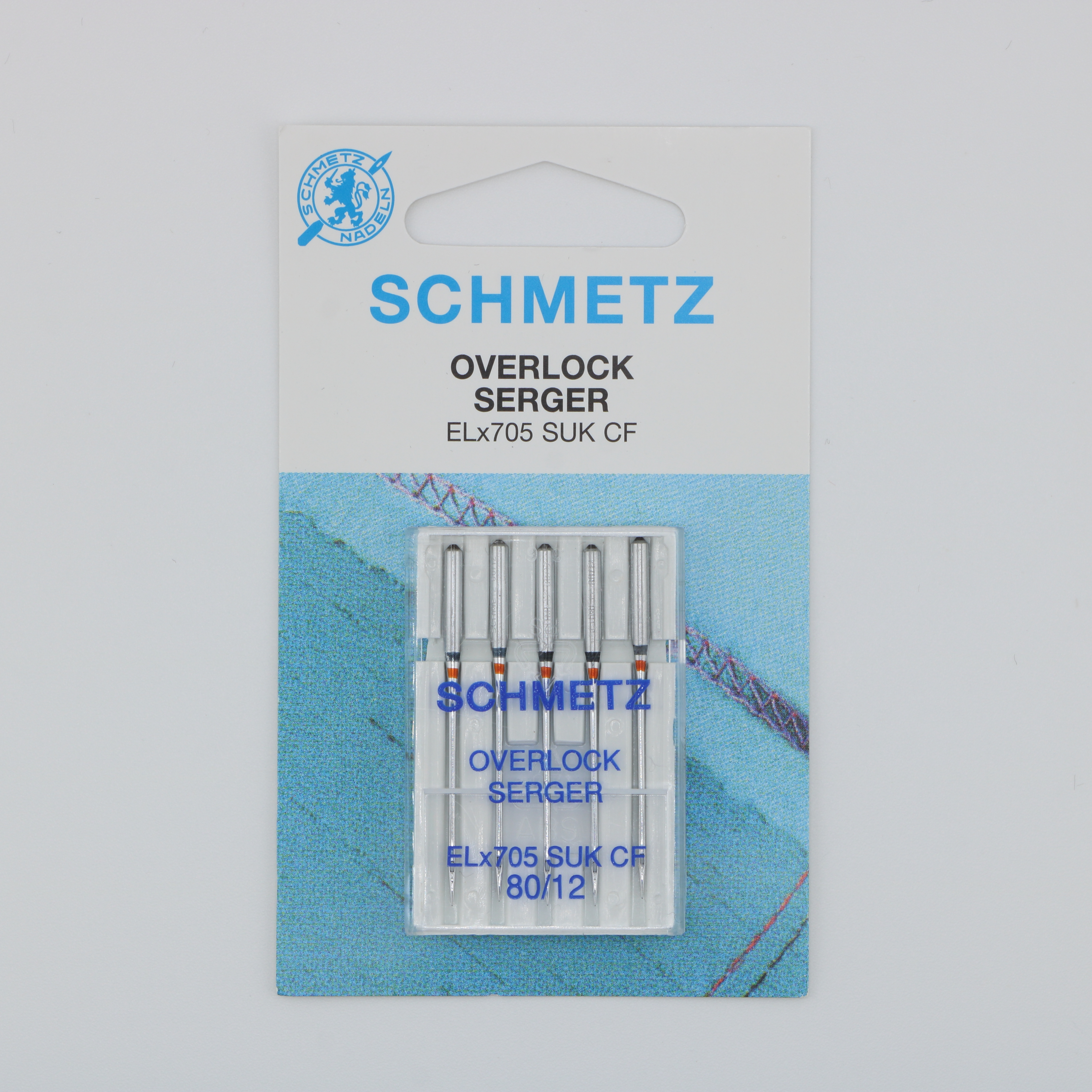 La Schmetz Overlock ELx705 CF SUK NM 80 est spécialement conçue pour la couture des tissus extensibles et en maille avec une surjeteuse ou une recouvreuse familiale. Sa pointe à bille moyenne (SUK) écarte les mailles au lieu de les percer, évitant ainsi les fils tirés, les trous ou les points sautés.