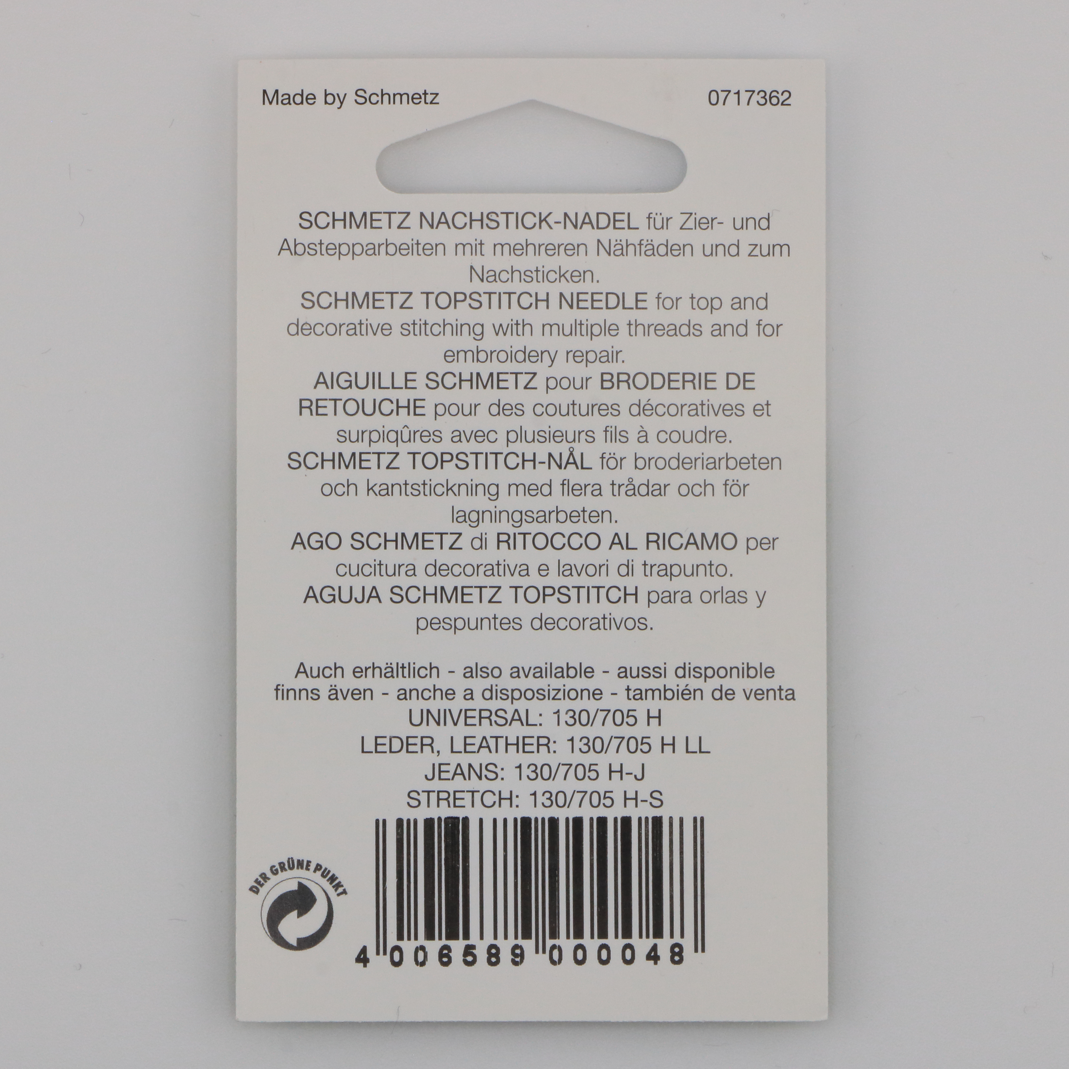 Aiguille spéciale Topstitch NM 90, système 130/705 H-N. Idéale pour les coutures visibles, fils décoratifs, métalliques ou épais. Son long chas évite les frictions et garantit une couture nette, même avec plusieurs fils ou motifs contrastés.