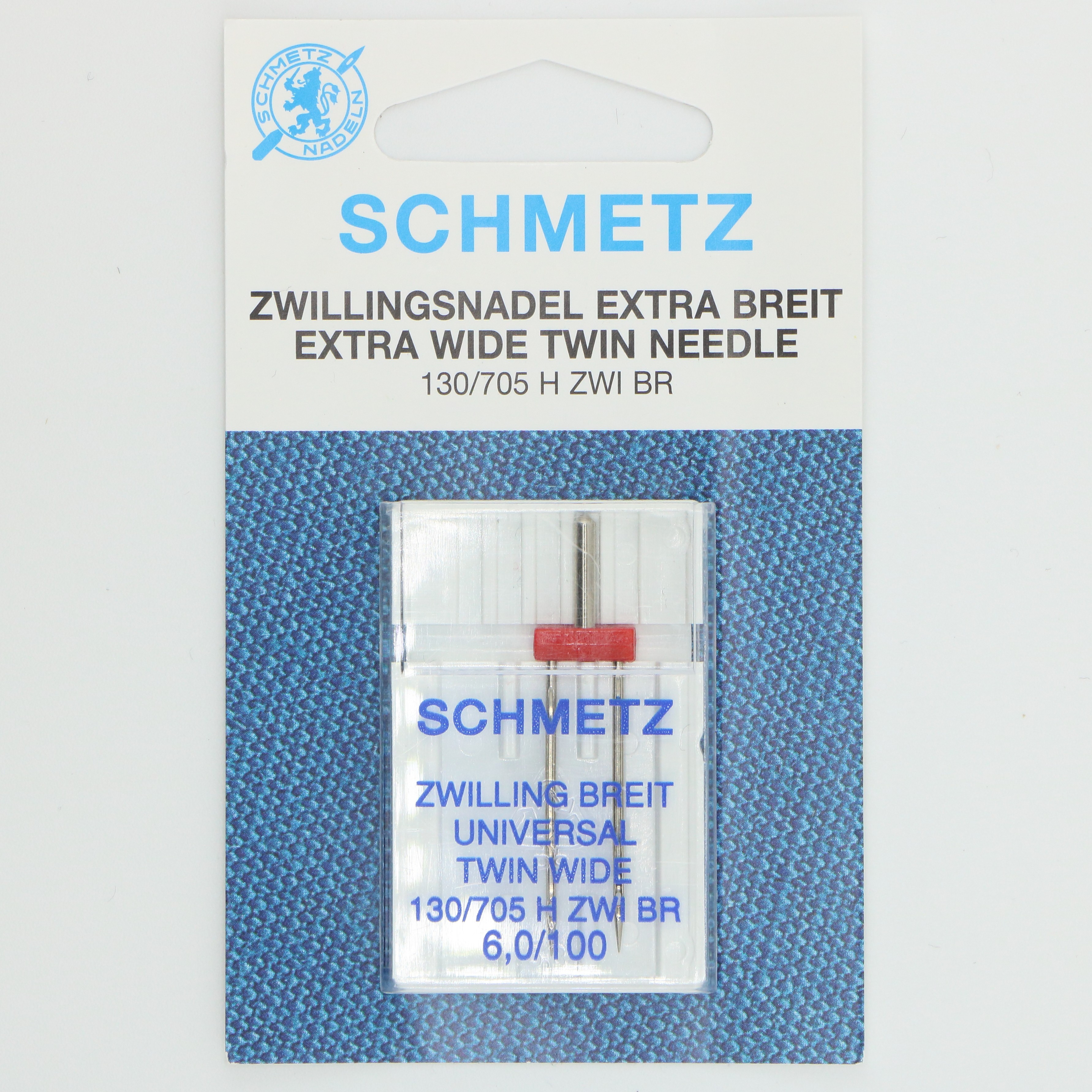 Aiguille double NM 100 avec un entraxe de 8 mm. Idéale pour coutures décoratives larges sur toile, coton épais ou lin. Pointe universelle robuste pour pénétrer proprement les fibres. Système 130/705 H ZWI, compatible avec les machines familiales acceptant les aiguilles doubles larges.