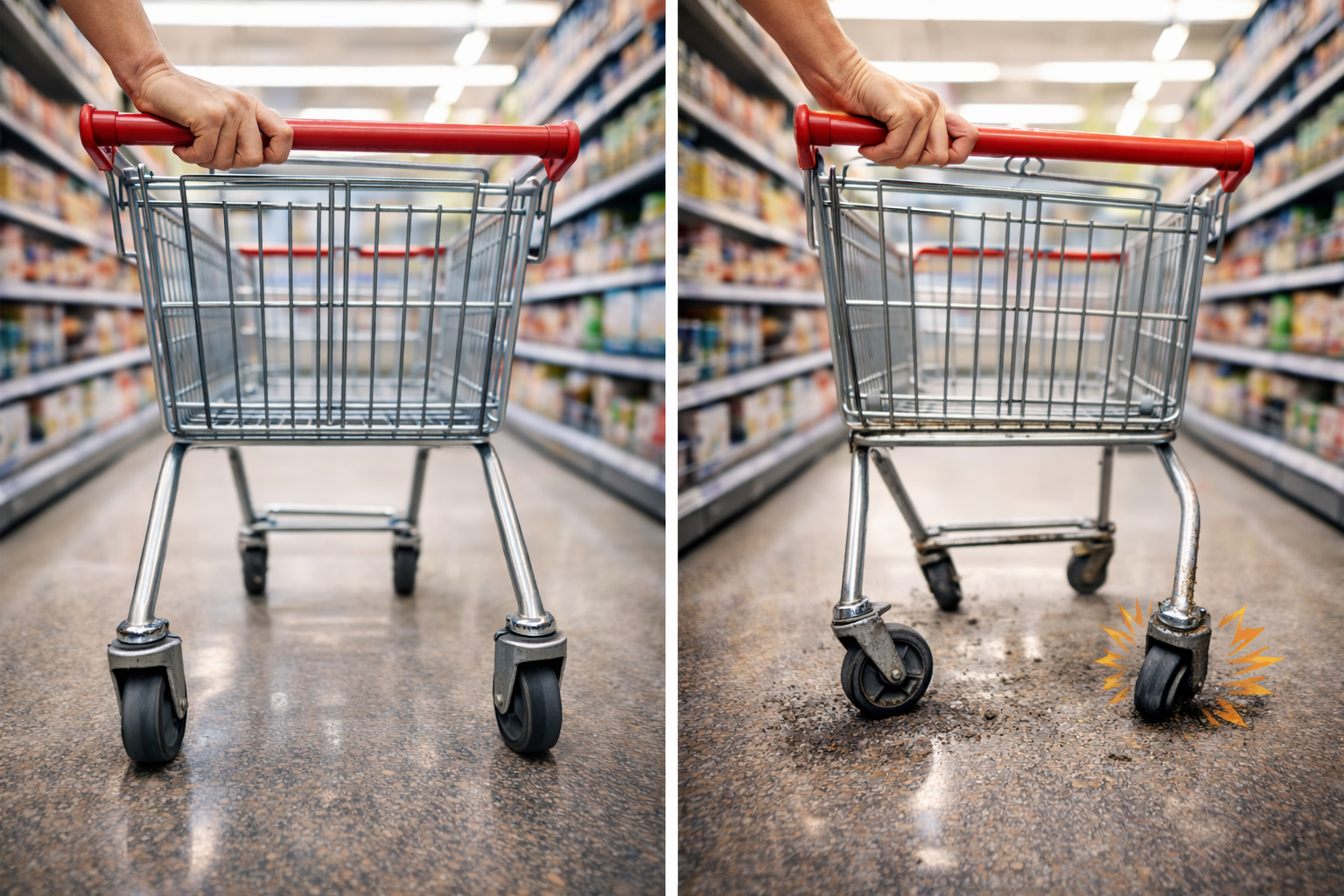 Maintenant, imaginez ce même caddie avec des roues grippées ou tordues. Chaque mouvement devient irrégulier, ça force, ça accroche, et vous devez compenser en permanence. Avouez que vous avez tous été déjà dans cette situation énervante.
