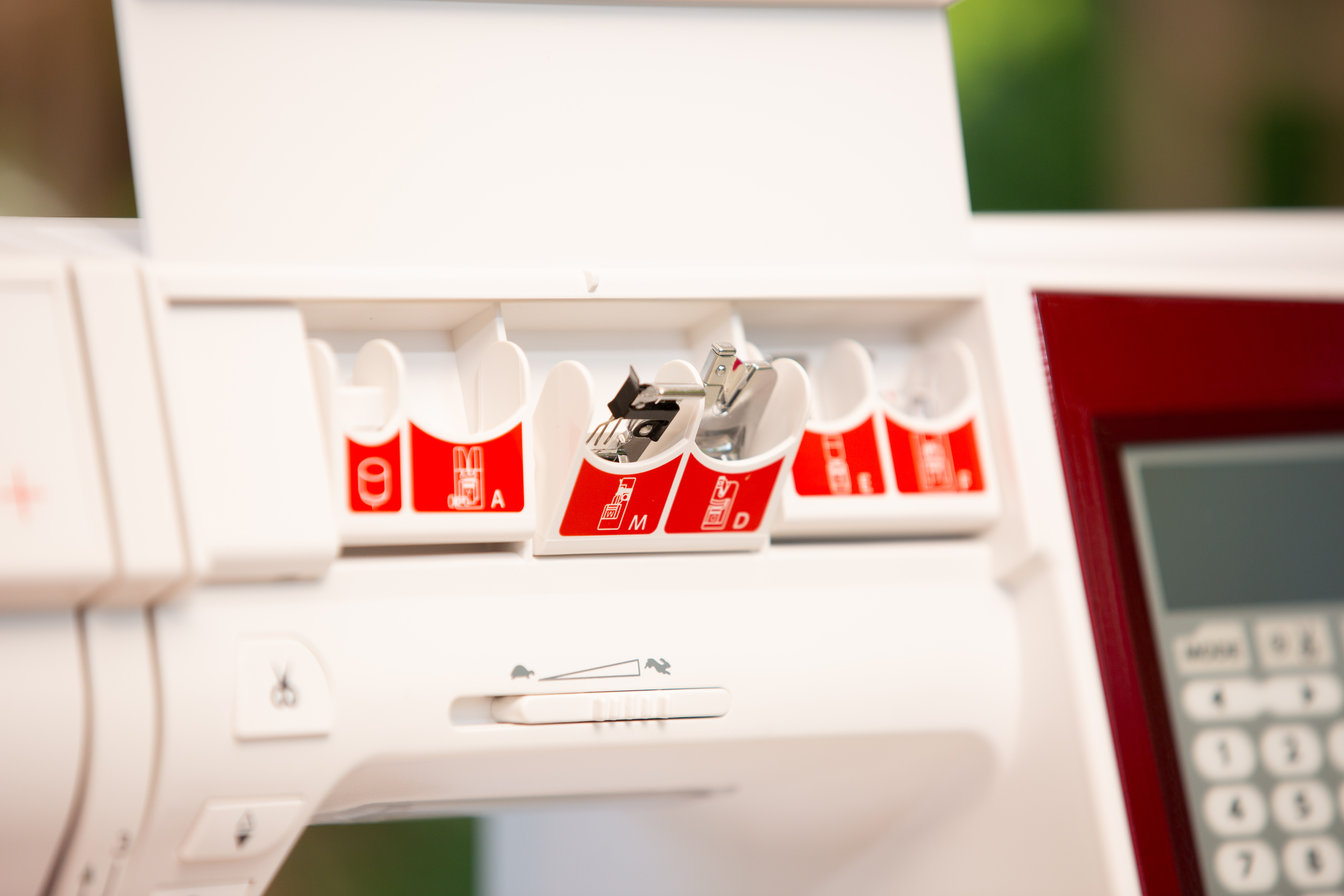 De plus, Elna a toujours veillé à offrir des solutions de rangement efficaces pour ses accessoires, afin de maintenir un espace de travail organisé. La façade de la machine a été soigneusement conçue pour permettre un rangement pratique des pieds les plus utiles, évitant ainsi leur perte et facilitant leur accessibilité.