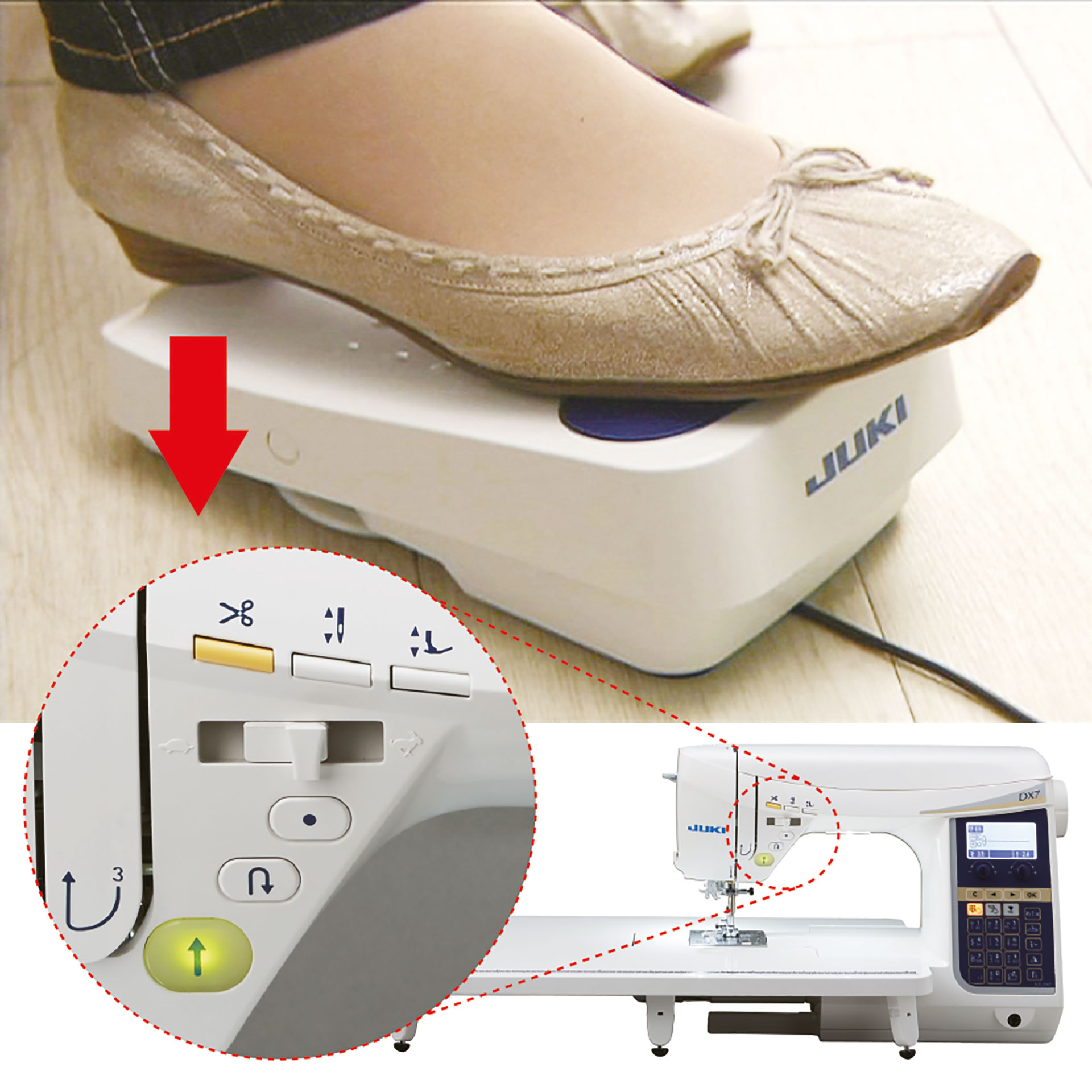 Comme la Juki F370, les Juki DX5 et Juki DX7 intègrent un positionneur d’aiguille permettant de choisir si l’aiguille reste en haut ou en bas lorsque le pied de la pédale est levé.
