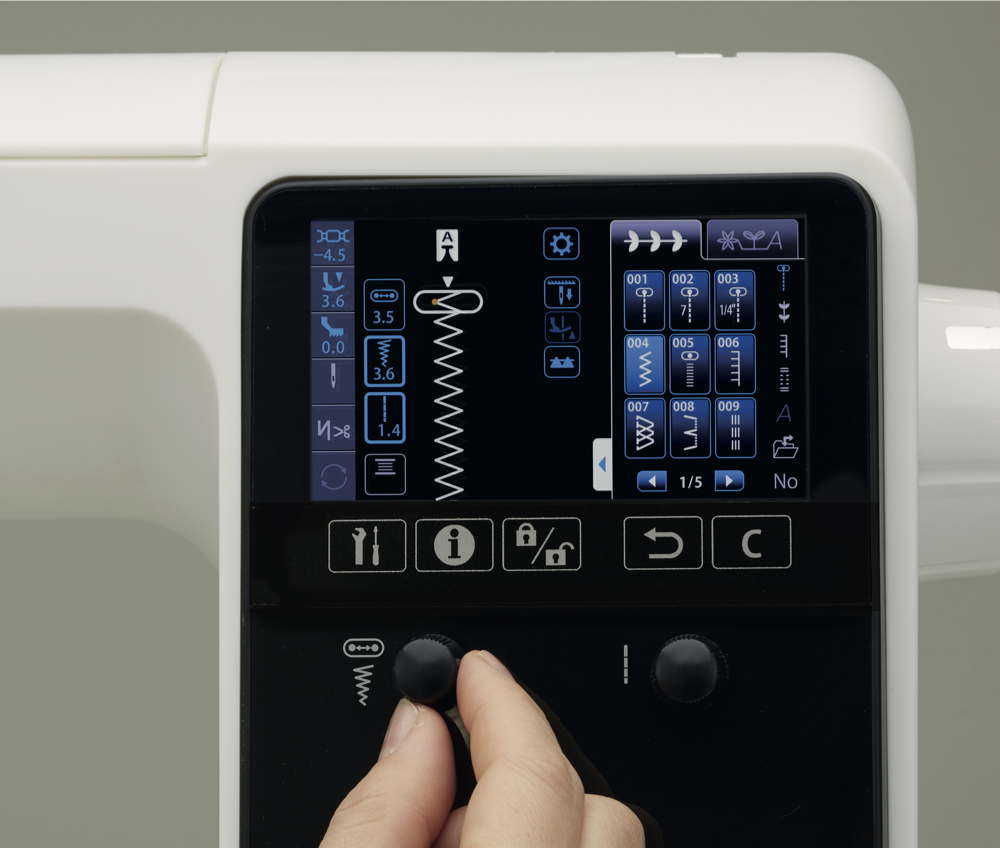 L’interface principale de la Juki NX7 se compose d’un écran tactile intuitif et de deux potentiomètres : l’un pour régler la longueur du point et l’autre pour la largeur.