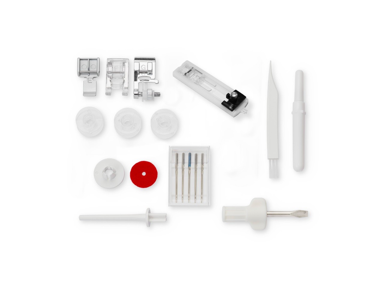 Accessoires inclus Canettes (x3), Assortiment d'aiguilles, Pinceau de nettoyage, Découd-vite, Tournevis, Tige porte-bobine supplémentaire, Disque fixe-bobine (petit x1 et large x1), Pédale, Câble d'alimentation, Housse de protection